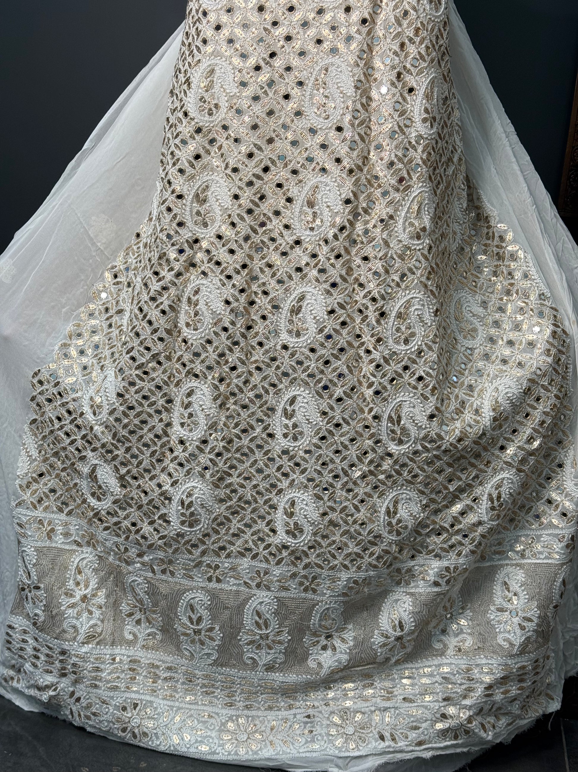 Gracefully handcrafted, this unstitched 2-piece Georgette Anarkali set is adorned with multi-cut Dana and delicate pearl work, blending refined embellishment with timeless elegance. Its 9-panel construction ensures a flowing, regal silhouette — perfect for any grand celebration.
