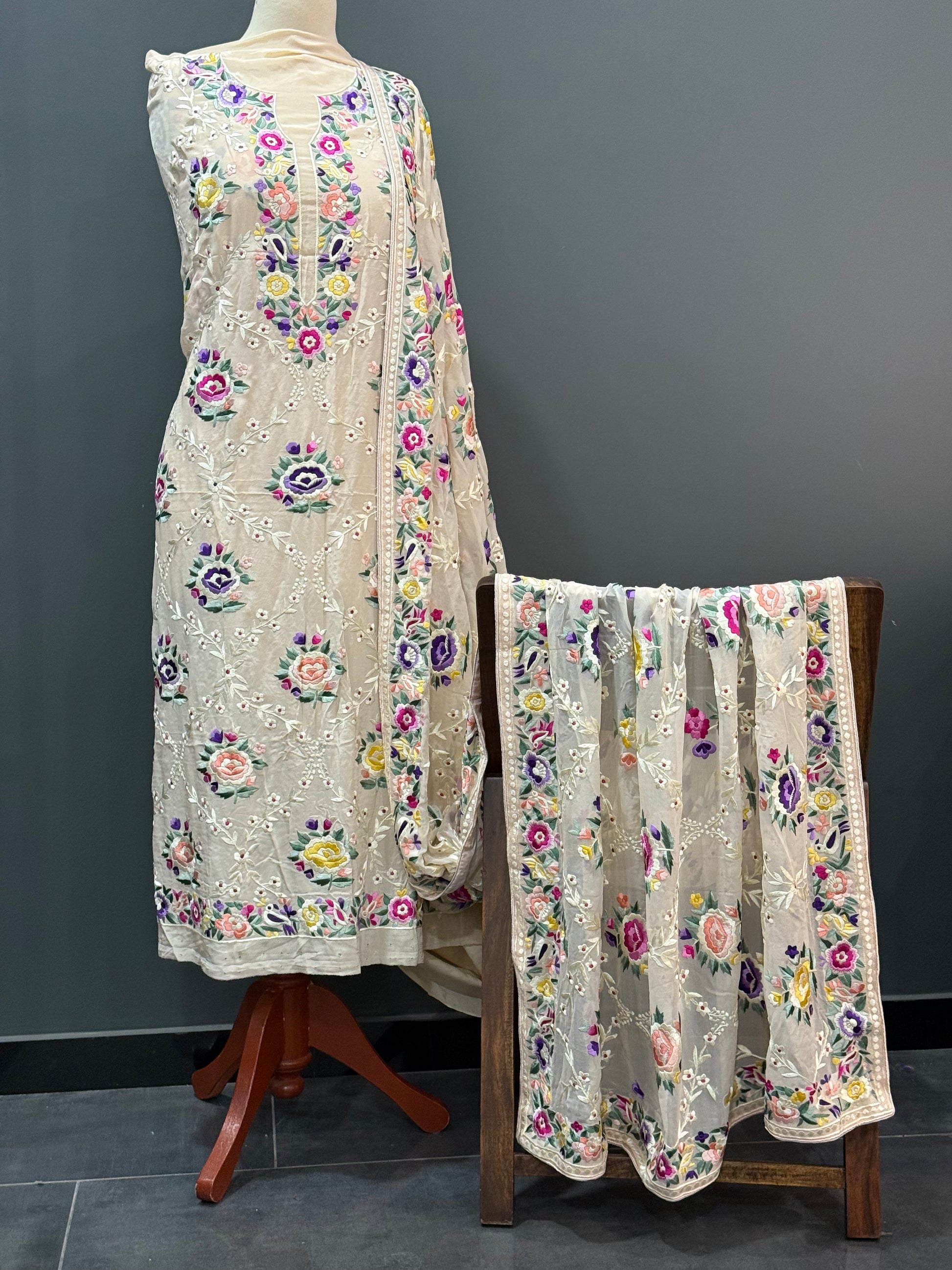 A breathtaking ensemble showcasing the art of intricate Parsi Gara embroidery, crafted with unmatched precision and heritage flair. Perfect for wedding occasions, formal gatherings, or as a luxurious heirloom piece, this suit blends cultural richness with modern grace.