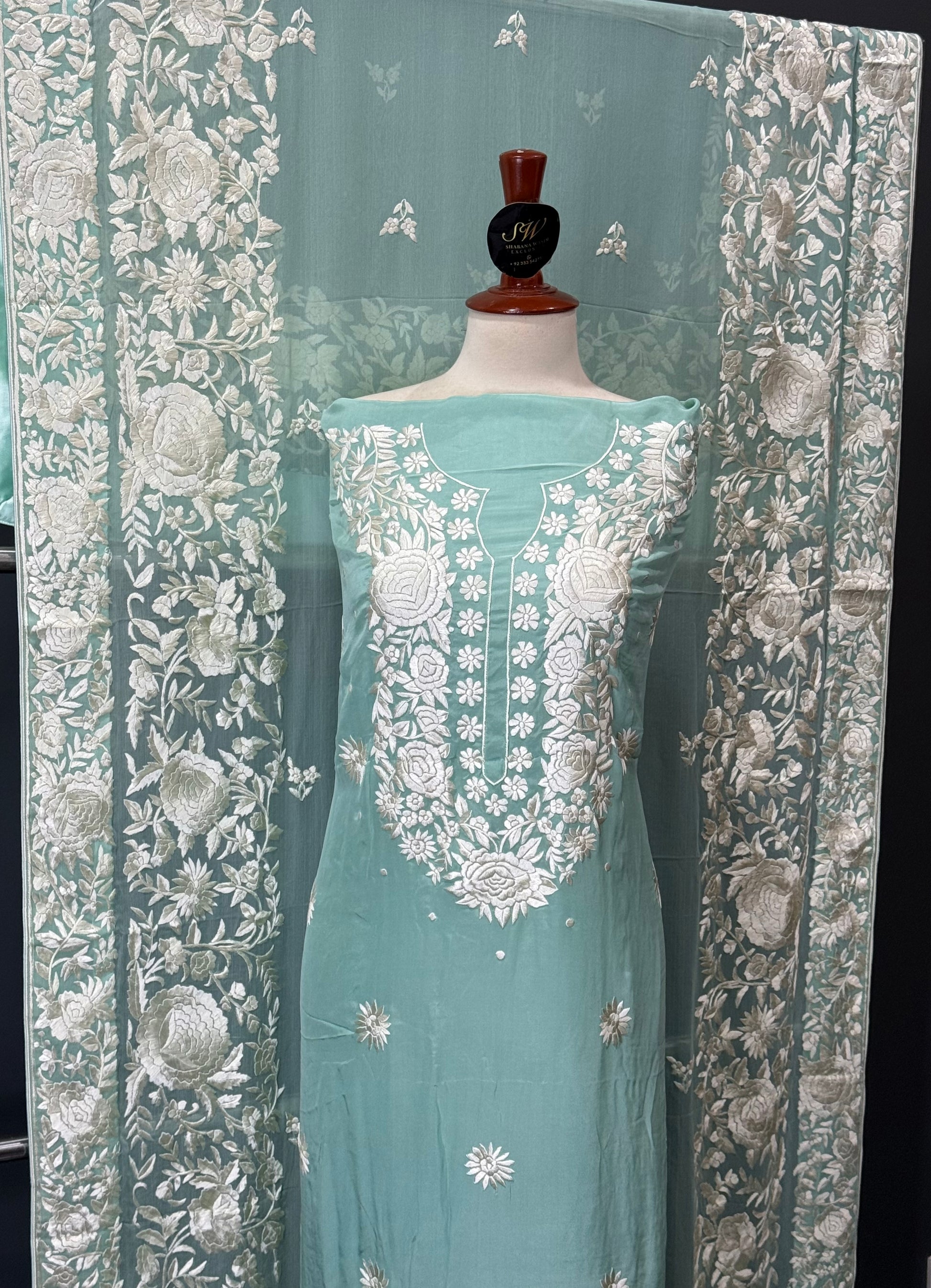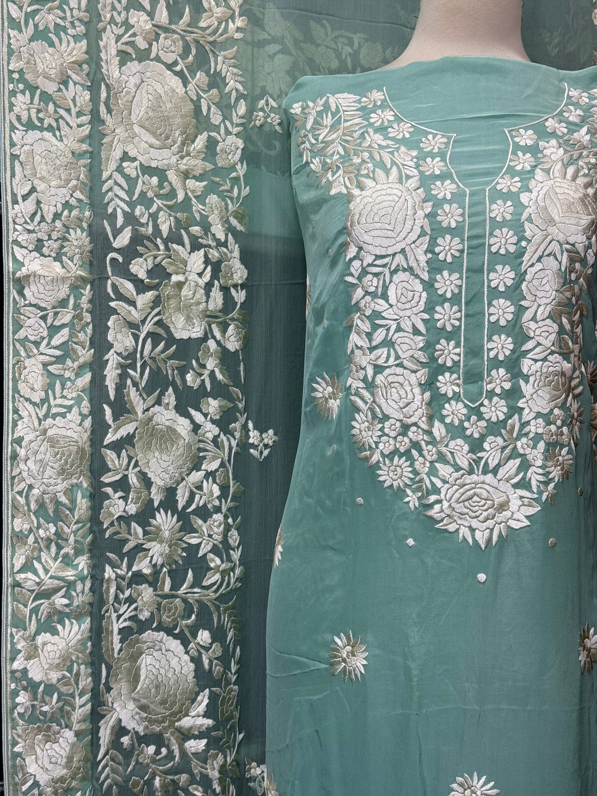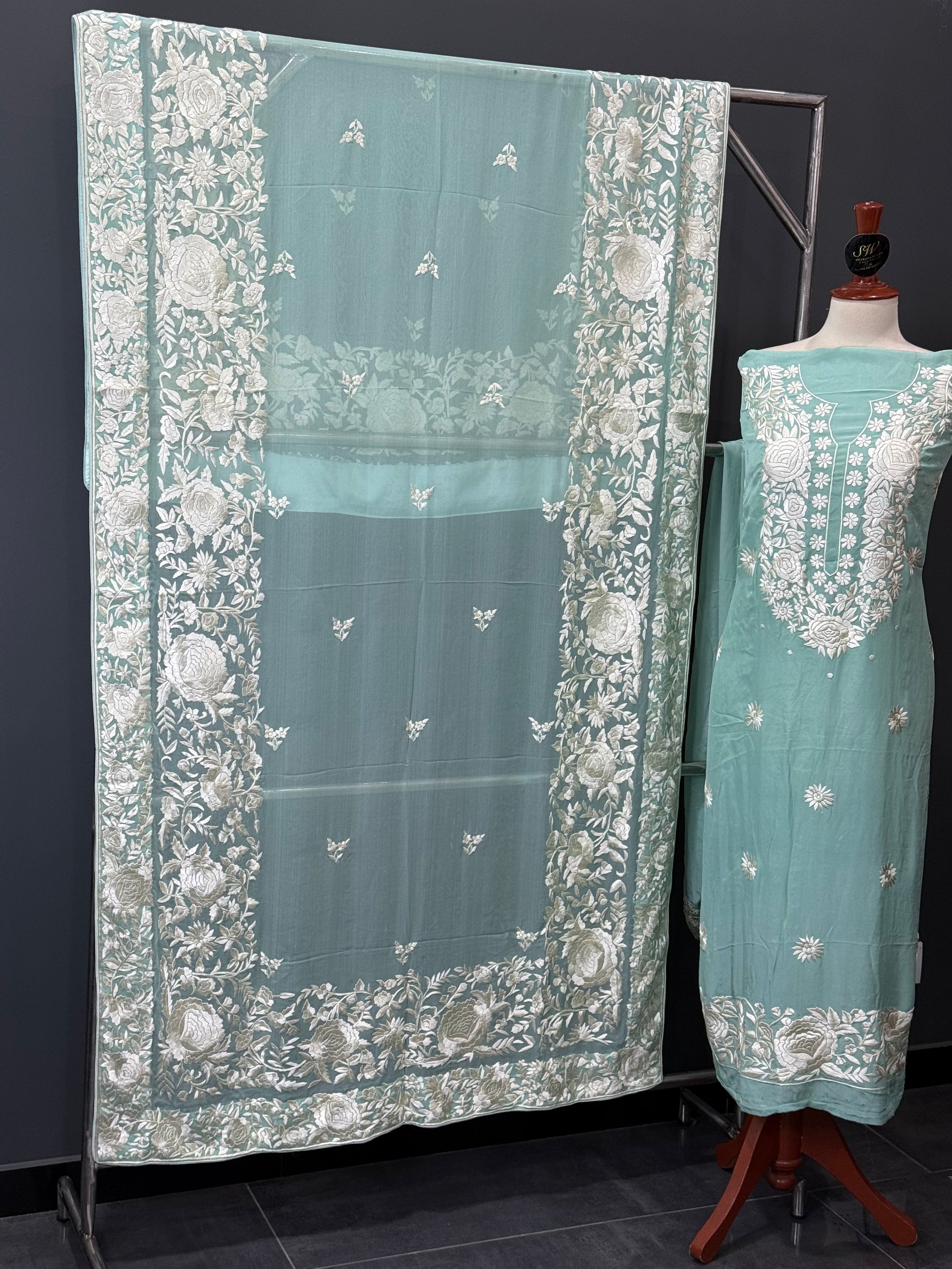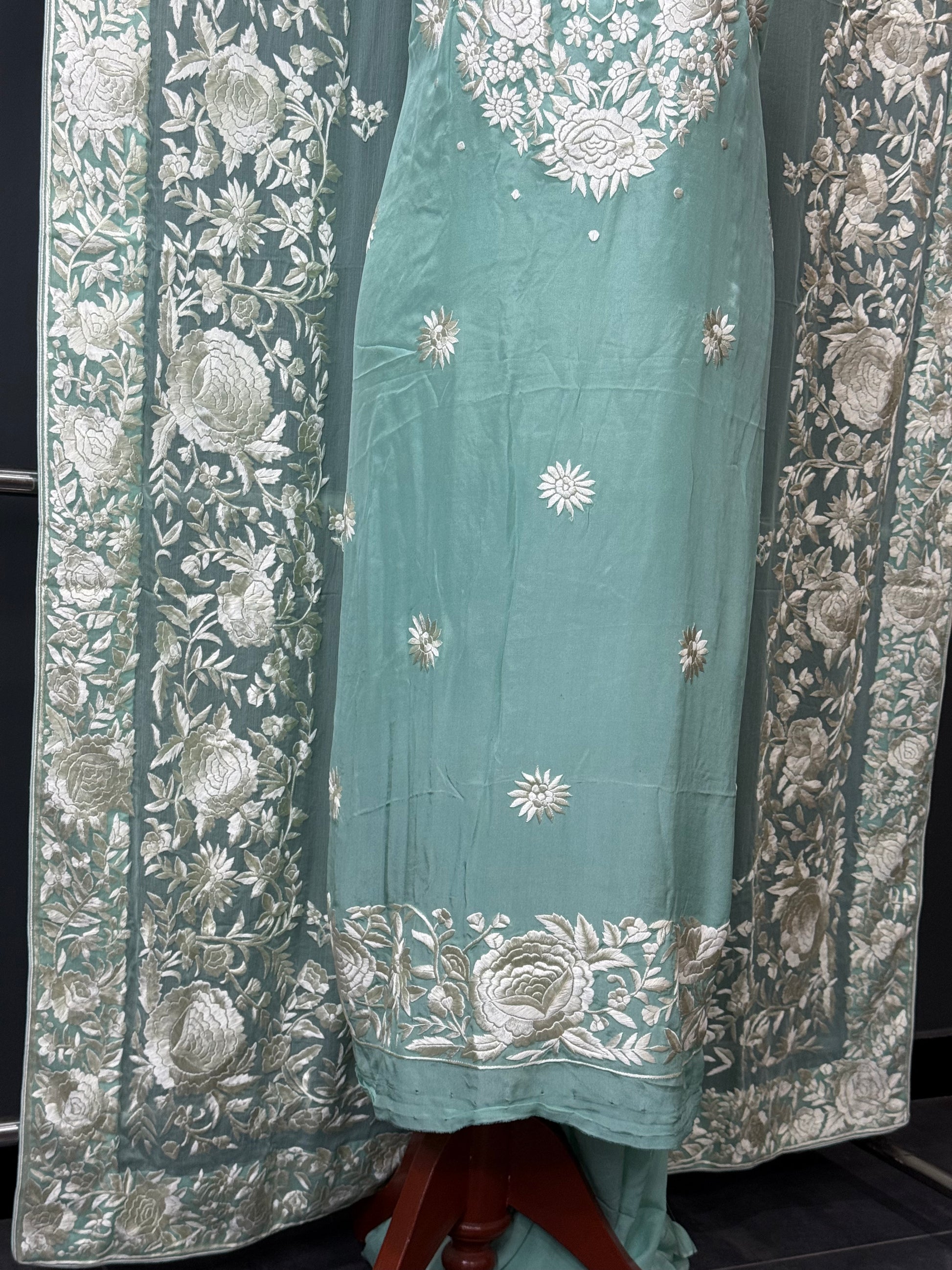 A breathtaking ensemble showcasing the art of intricate Parsi Gara embroidery, crafted with unmatched precision and heritage flair. Perfect for wedding occasions, formal gatherings, or as a luxurious heirloom piece, this suit blends cultural richness with modern grace.