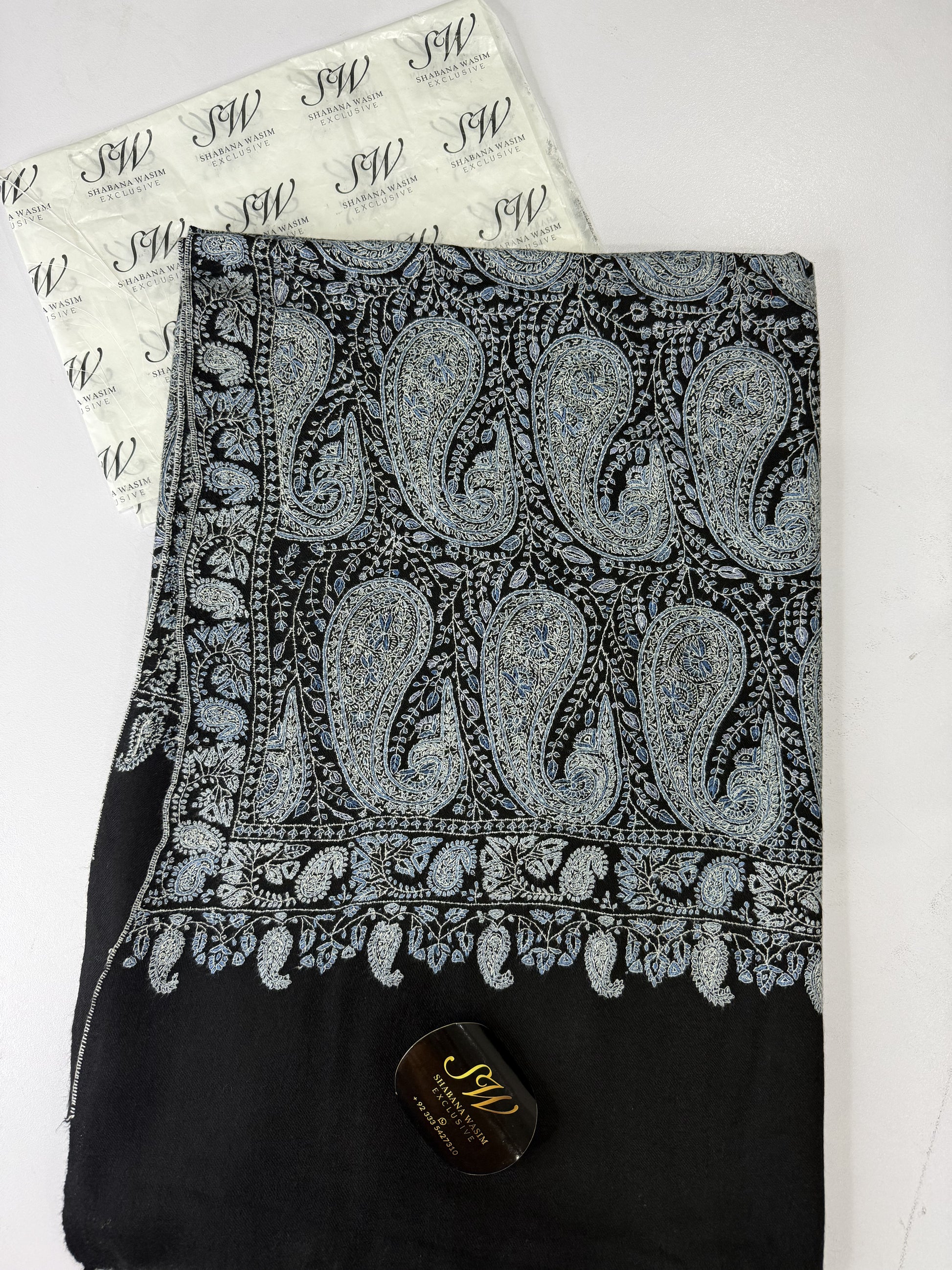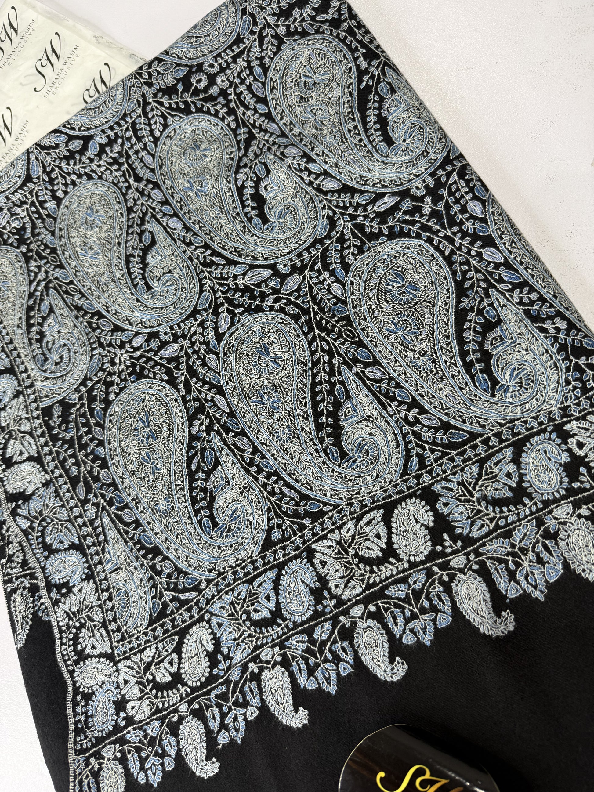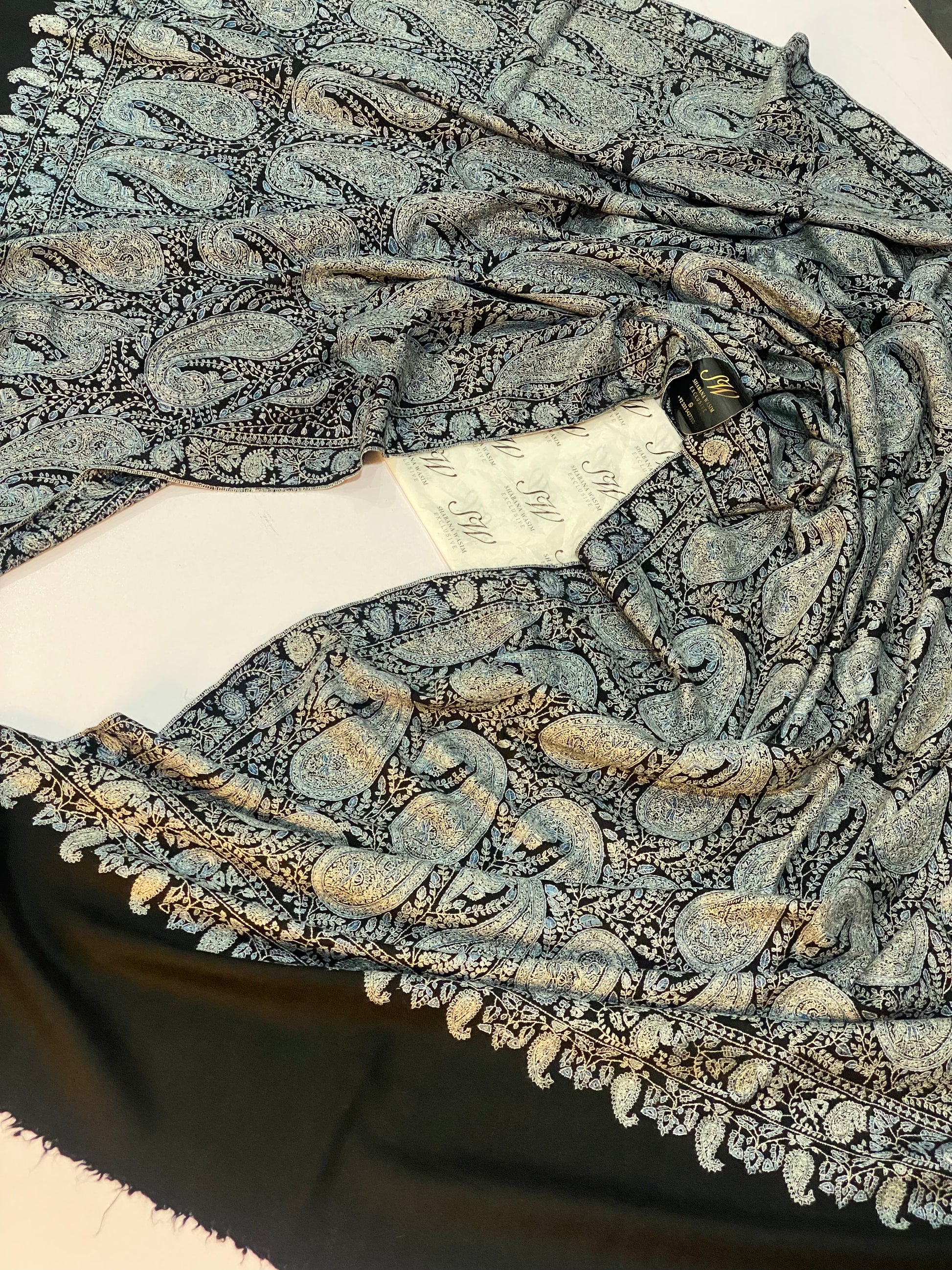 Woven on a luxurious bluish toosh base of pure Pashmina