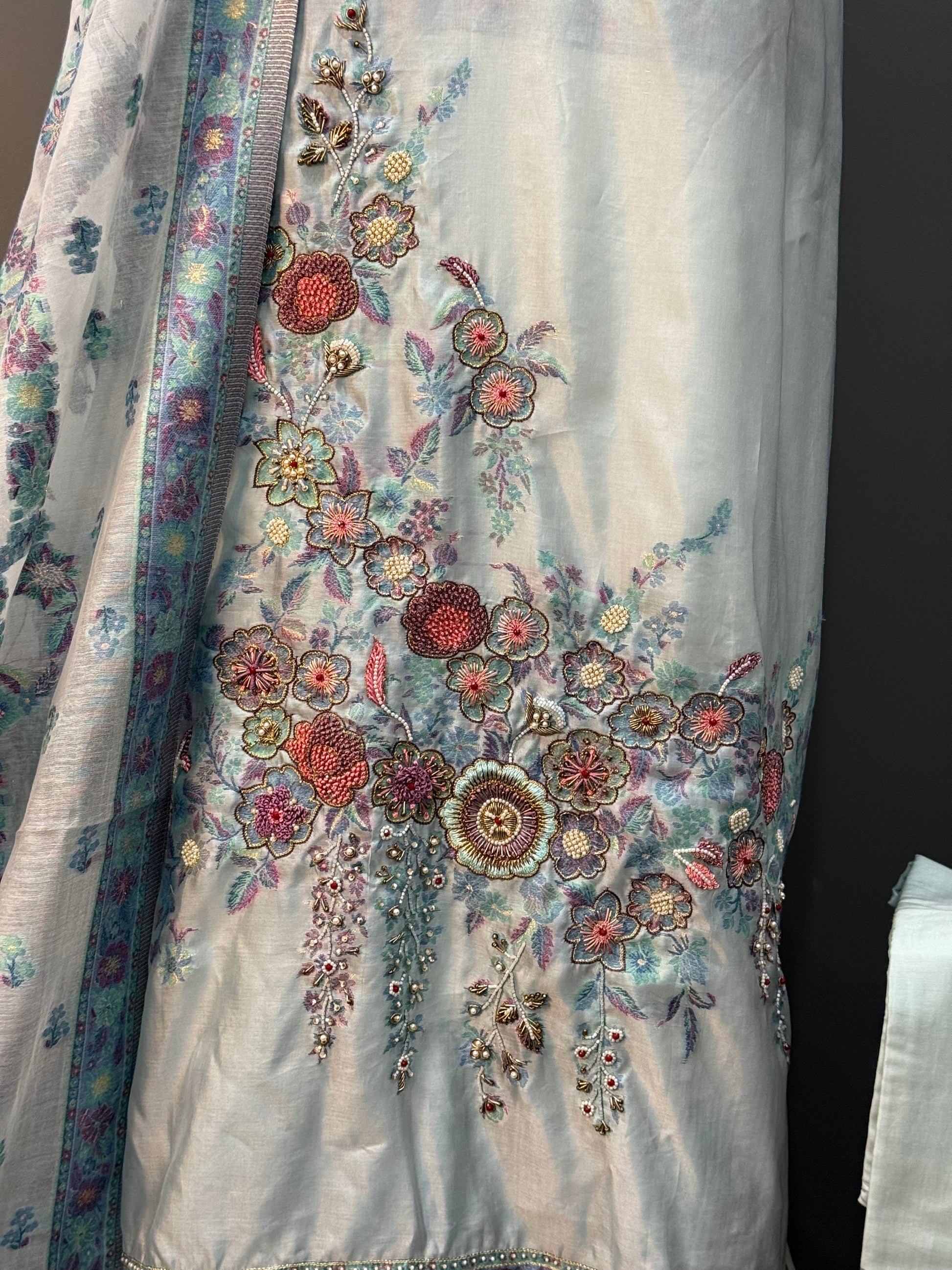Adorned with delicate resham embroidery, subtle moti accents, and shimmering cutdana work—every detail is thoughtfully placed to create a sophisticated sparkle without overwhelming the design.