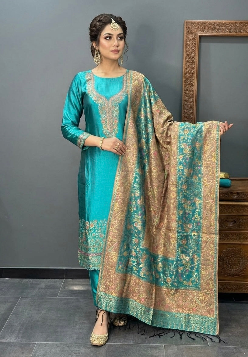 • Shirt: Approx. 3 meters, pure Kani silk with fine handwork on the front & sleeves